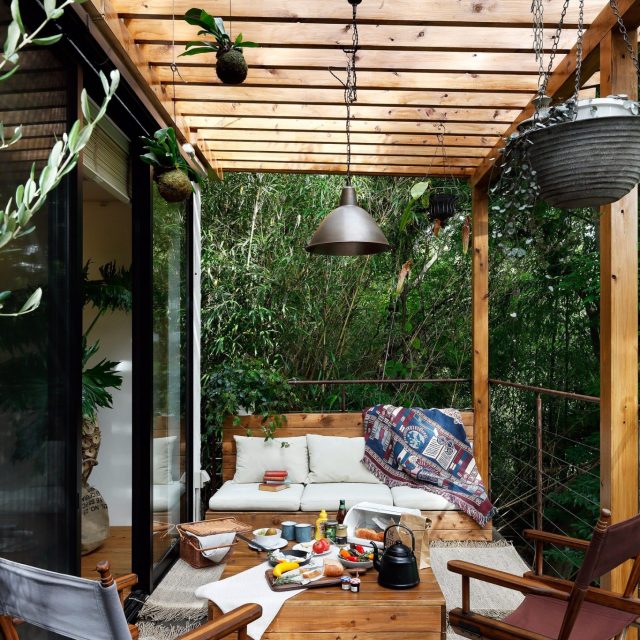 ↓奥のテーブルとソファは、パーゴラ作成と同時に大工さんに作ってもらったもの。