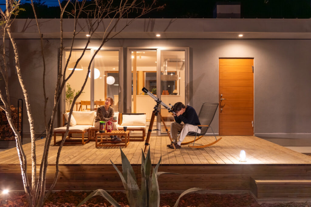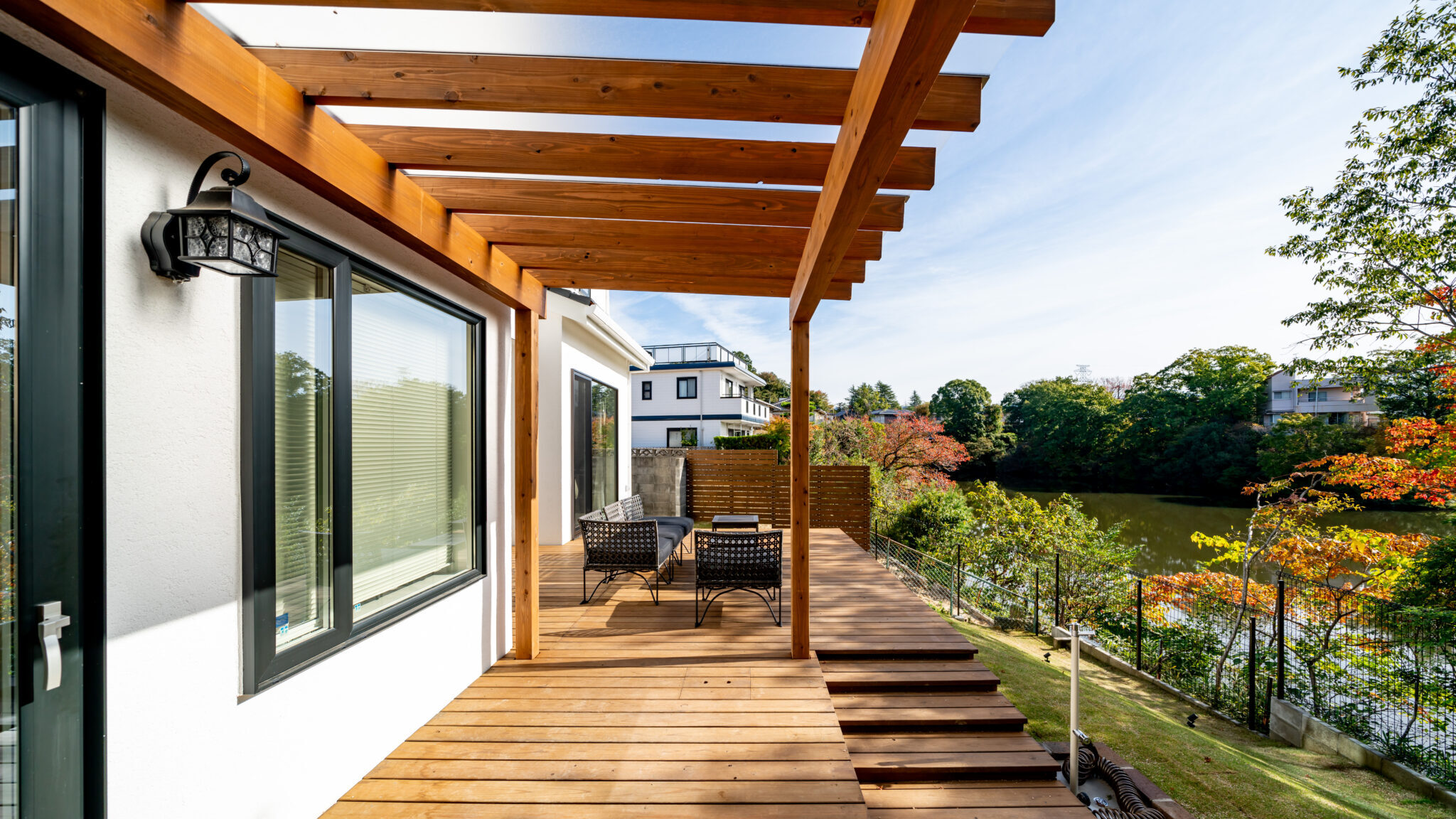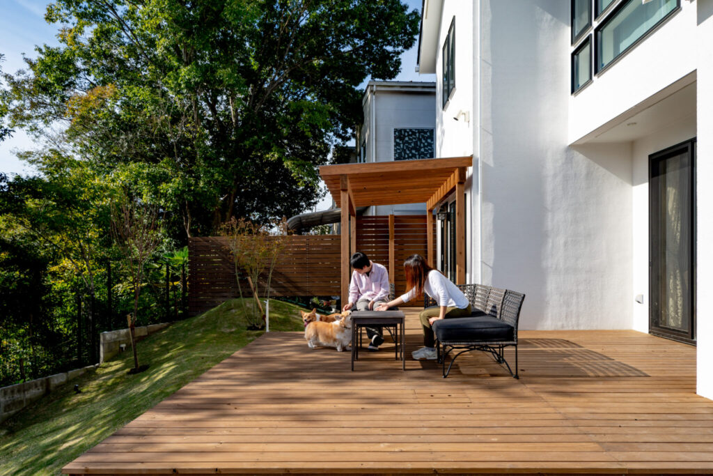 屋外空間には、加圧注入処理を施した高耐久の天然木「緑の木材」を採用。