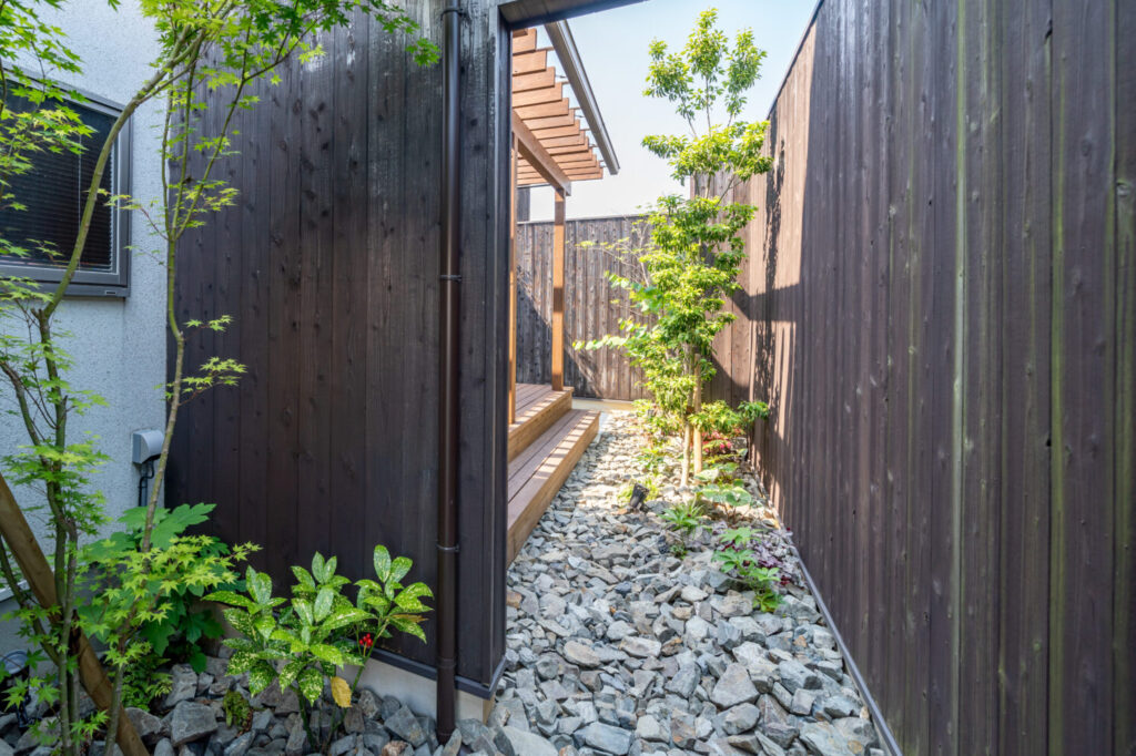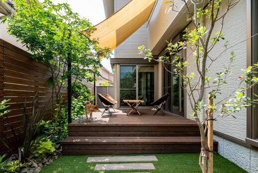 アウトドアを楽しむ、天然木デッキと植栽に包まれた庭のある住まい|大阪