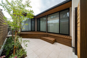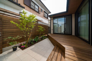 - 主な素材:塗り壁、木塀、ウッドデッキ、タイル