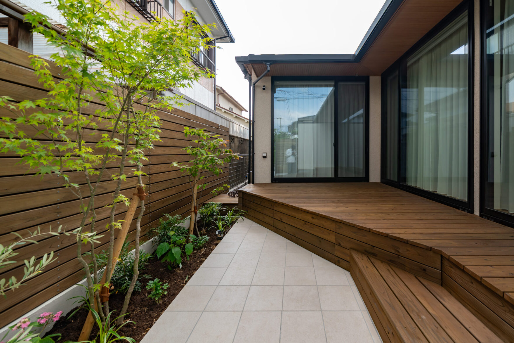 - 主な素材:塗り壁、木塀、ウッドデッキ、タイル
